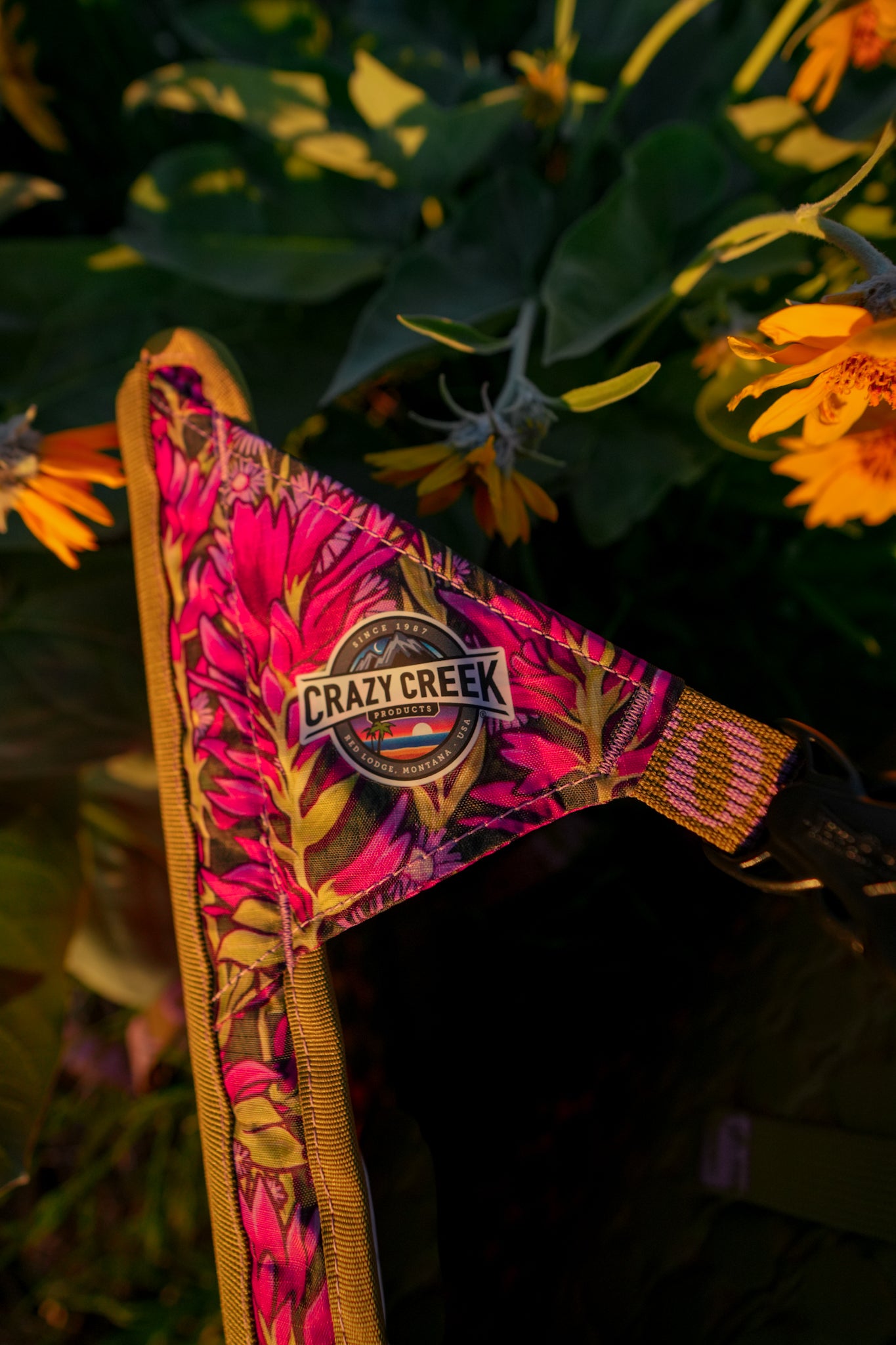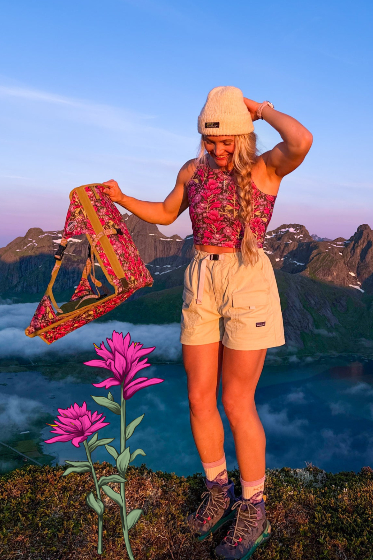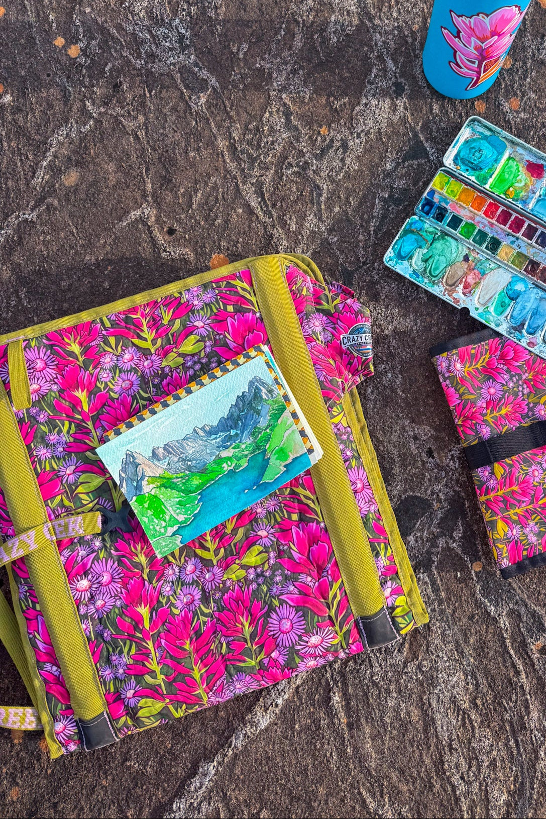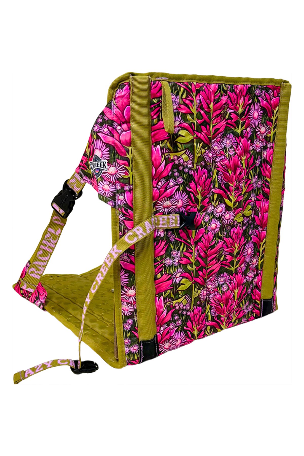 The outside is printed with Rachel's paintbrush from the original painting "August Paintbrush" of Pine Creek Lake in Montana, and the inside and trim is the most perfect olive green color! This vibrant chair combines bright pinks, pops of purple asters, bright green, and dark forest to create a truly unique and happy piece of gear you will want to bring with you everywhere all summer long, for years to come!