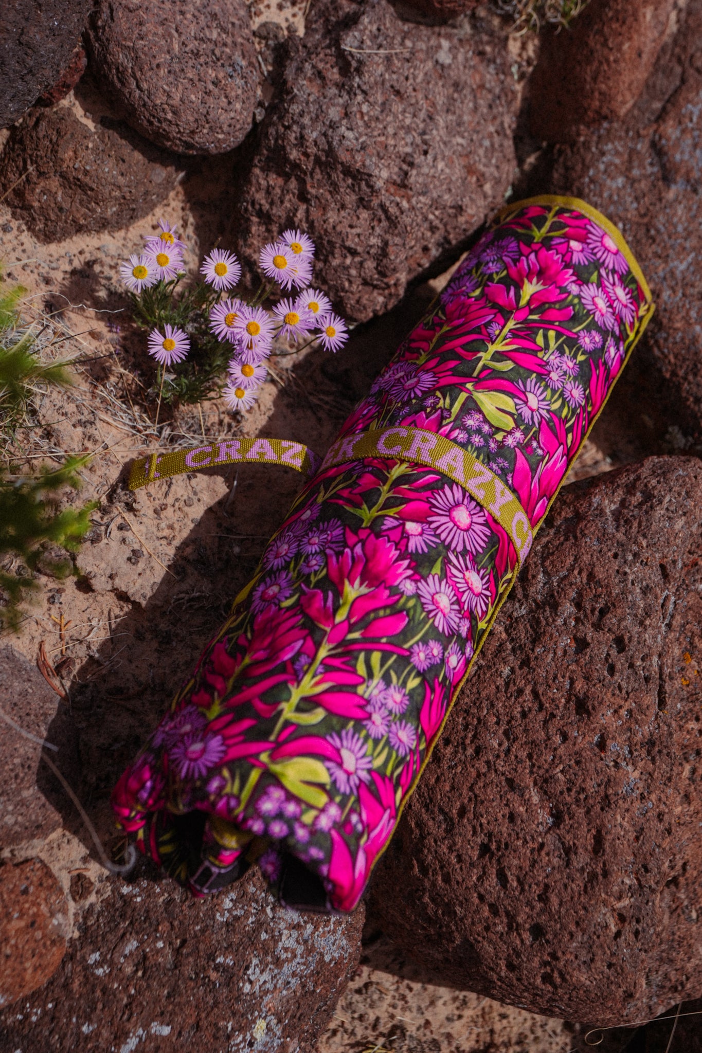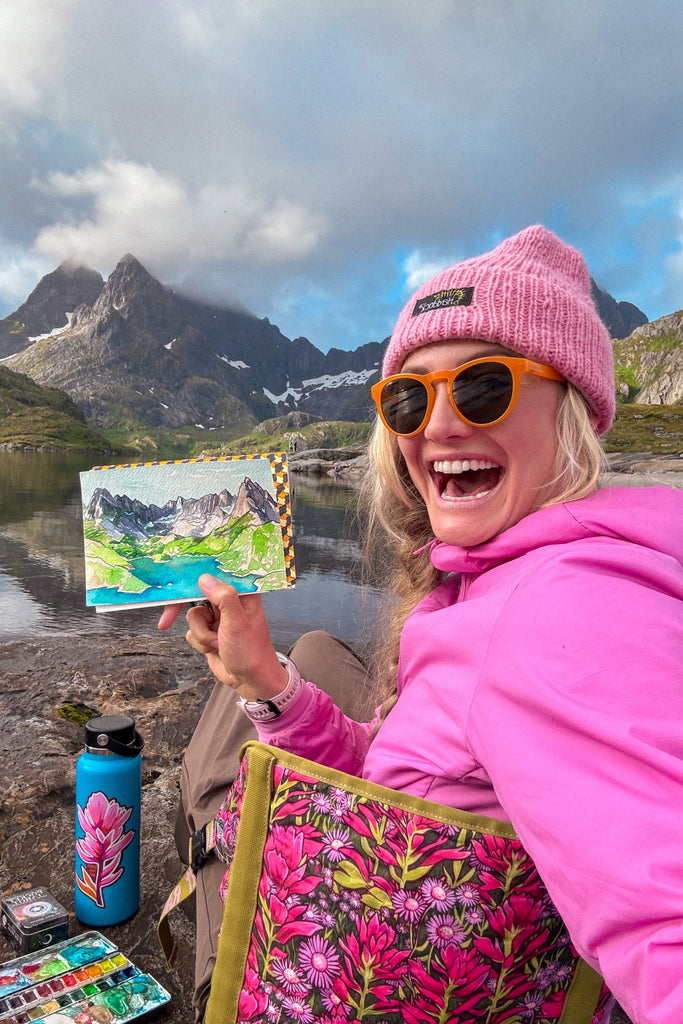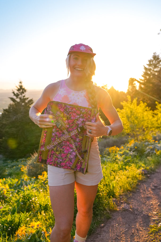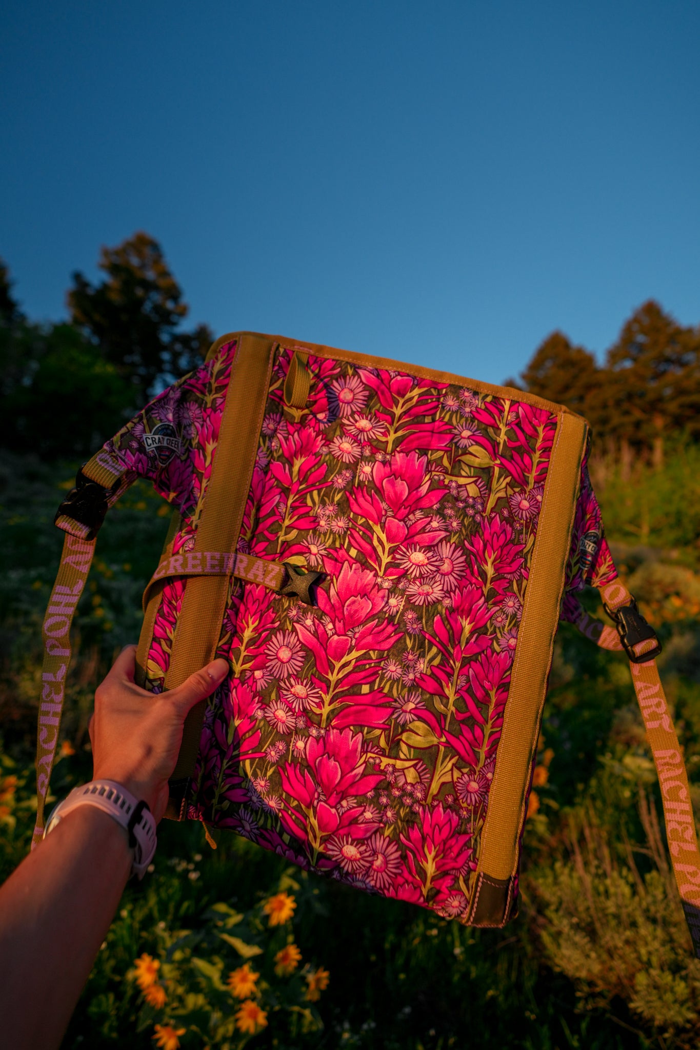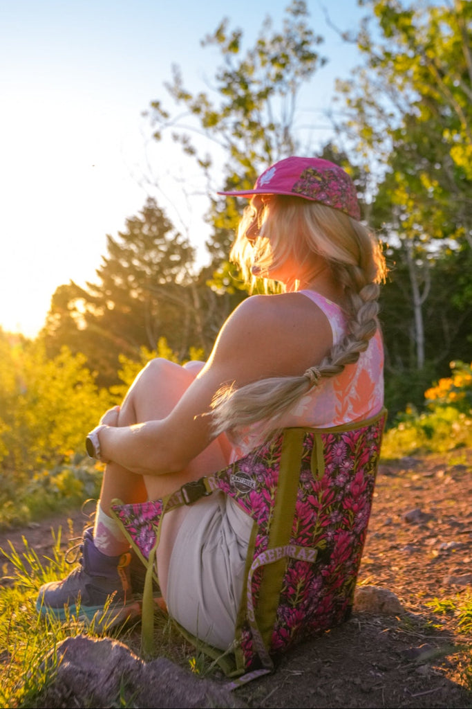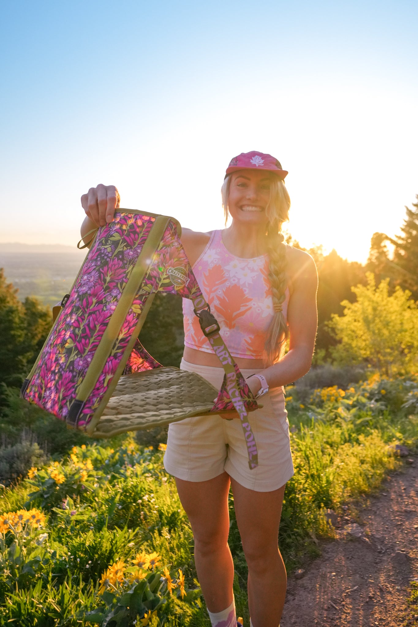 The outside is printed with Rachel's paintbrush from the original painting "August Paintbrush" of Pine Creek Lake in Montana, and the inside and trim is the most perfect olive green color! This vibrant chair combines bright pinks, pops of purple asters, bright green, and dark forest to create a truly unique and happy piece of gear you will want to bring with you everywhere all summer long, for years to come!
