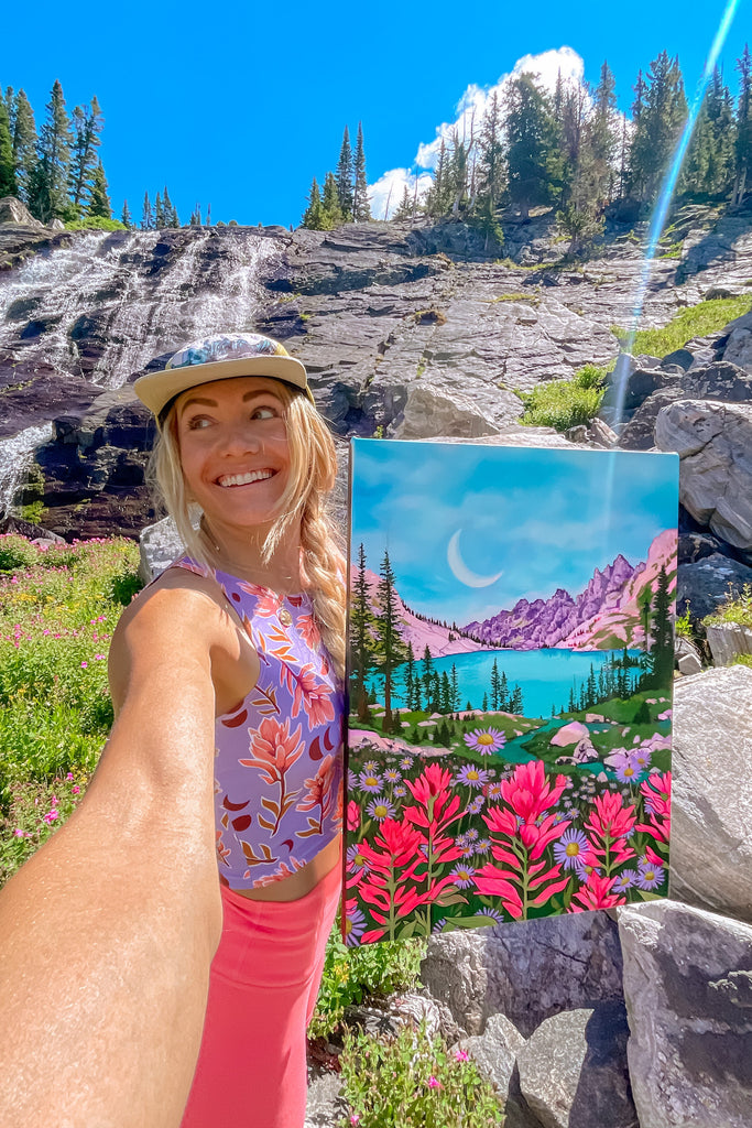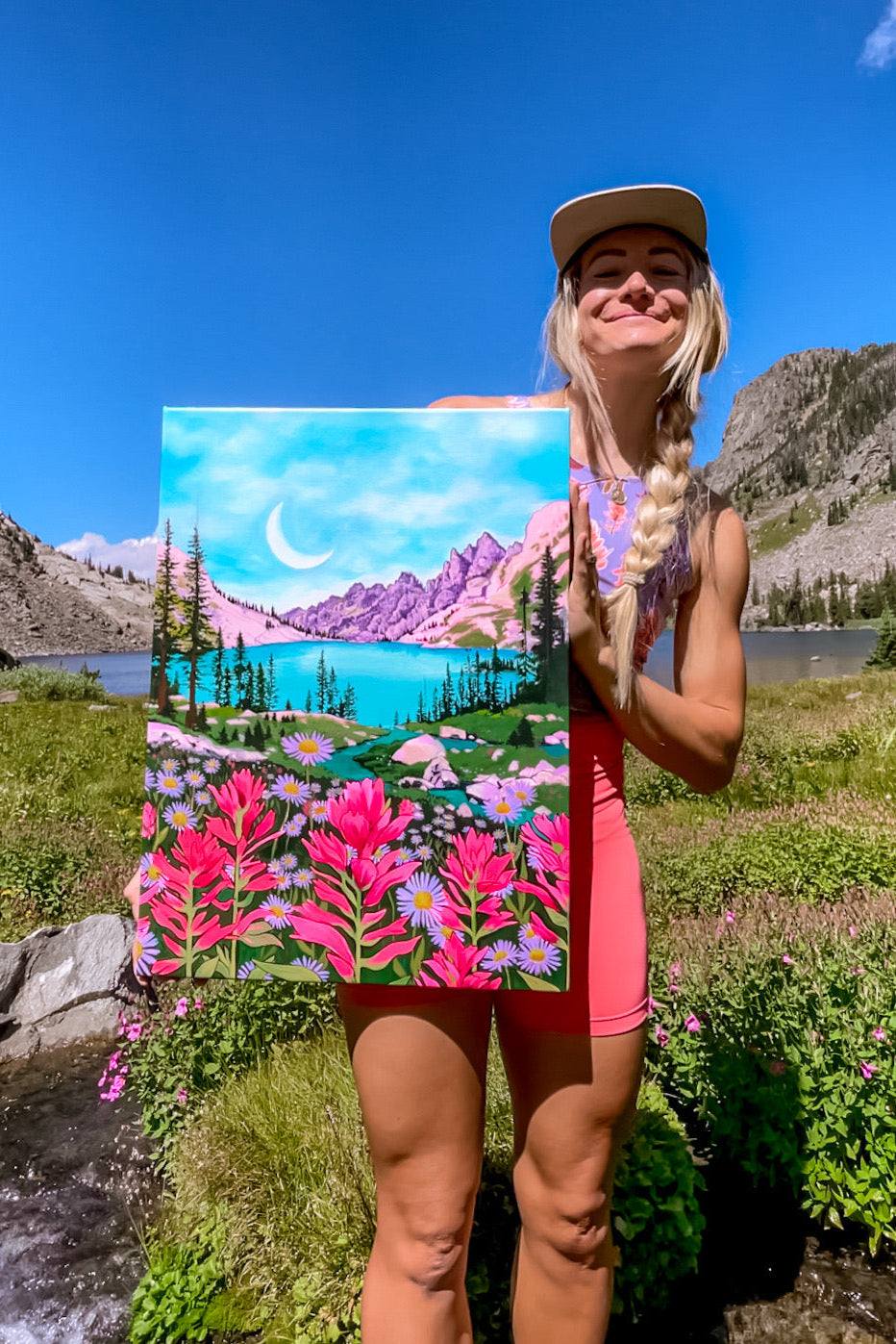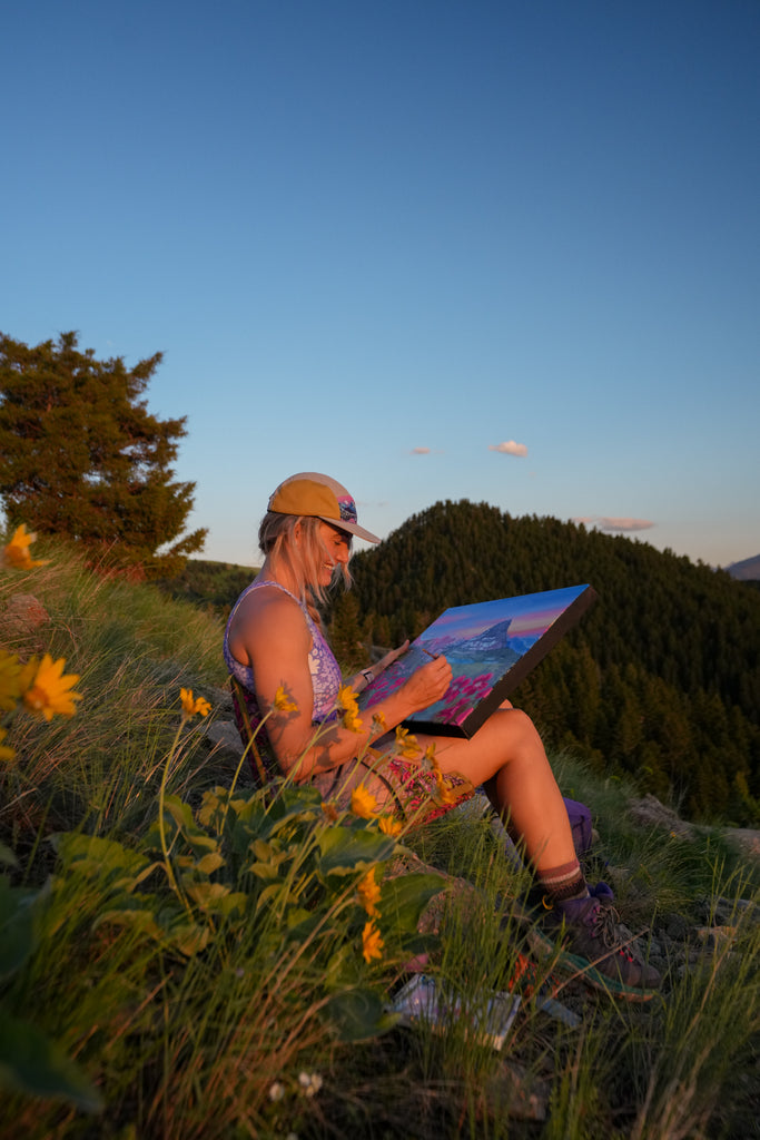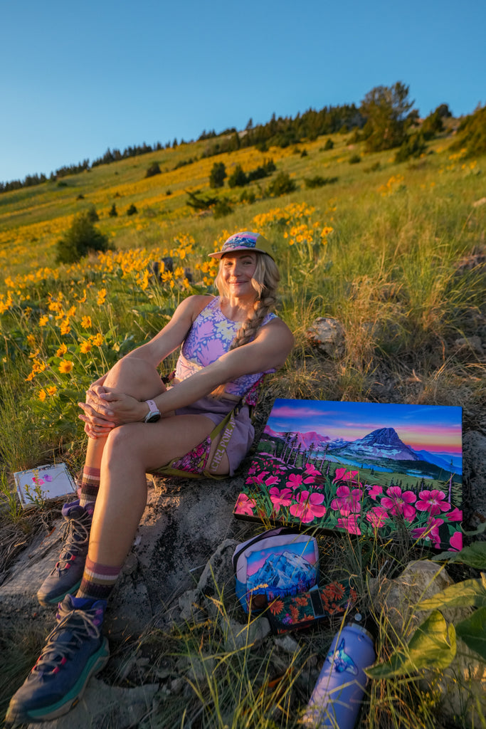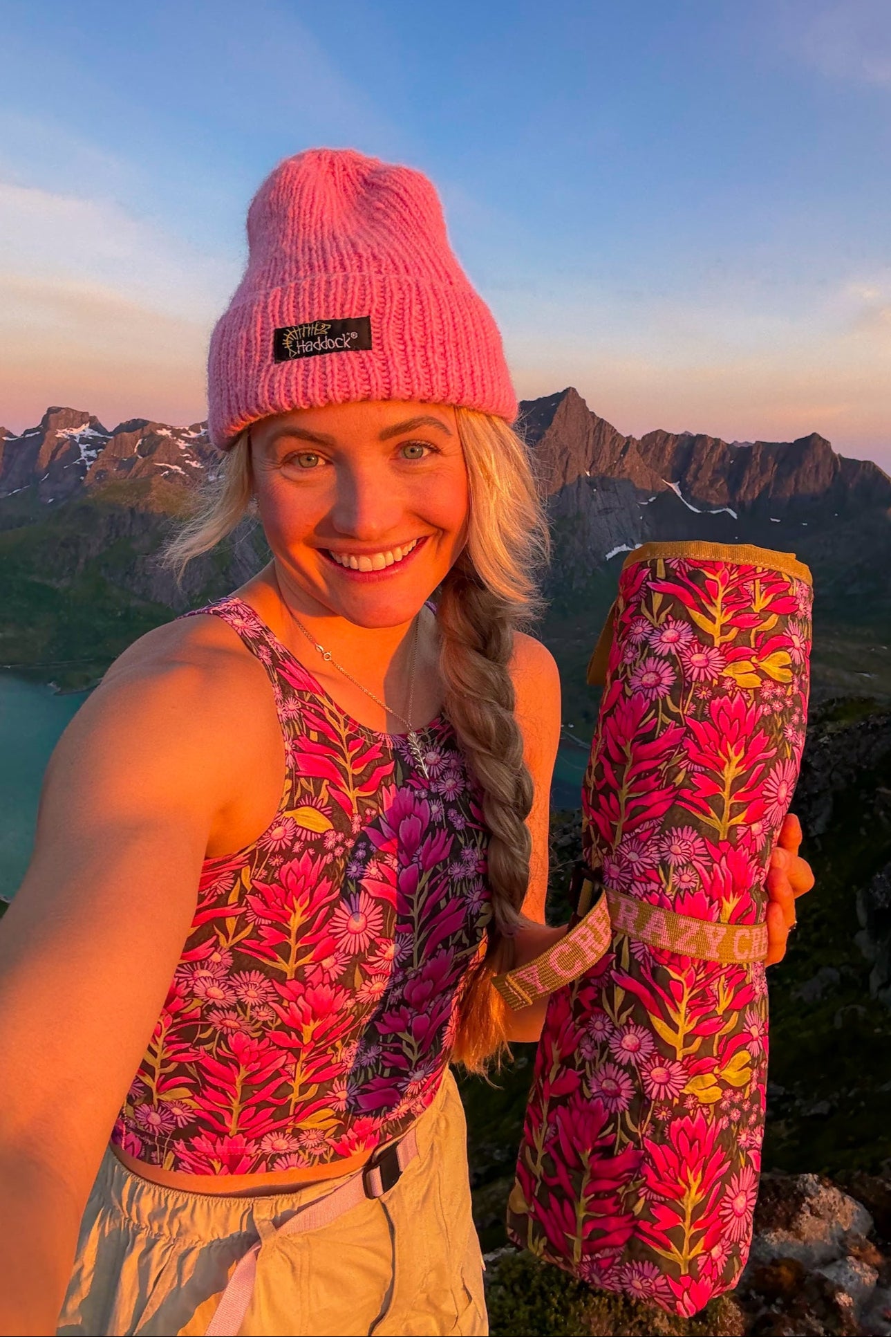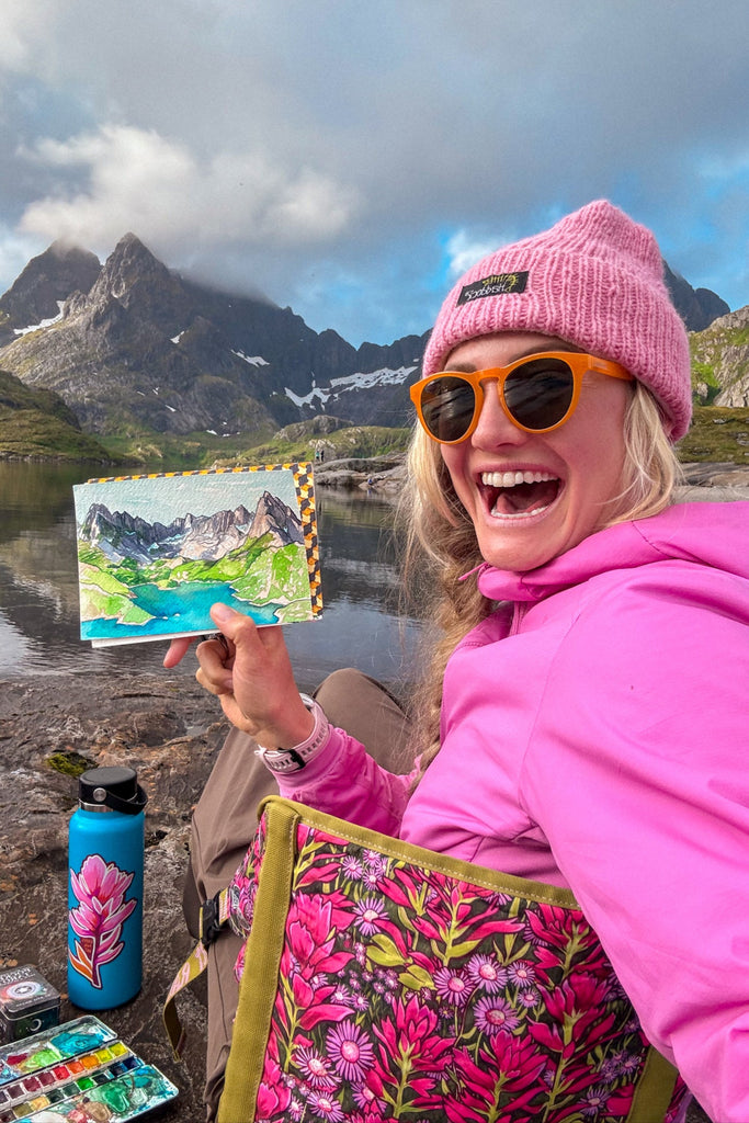 The outside is printed with Rachel's paintbrush from the original painting "August Paintbrush" of Pine Creek Lake in Montana, and the inside and trim is the most perfect olive green color! This vibrant chair combines bright pinks, pops of purple asters, bright green, and dark forest to create a truly unique and happy piece of gear you will want to bring with you everywhere all summer long, for years to come!