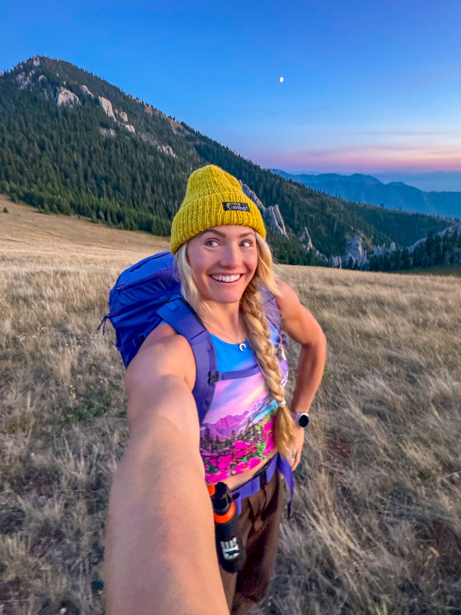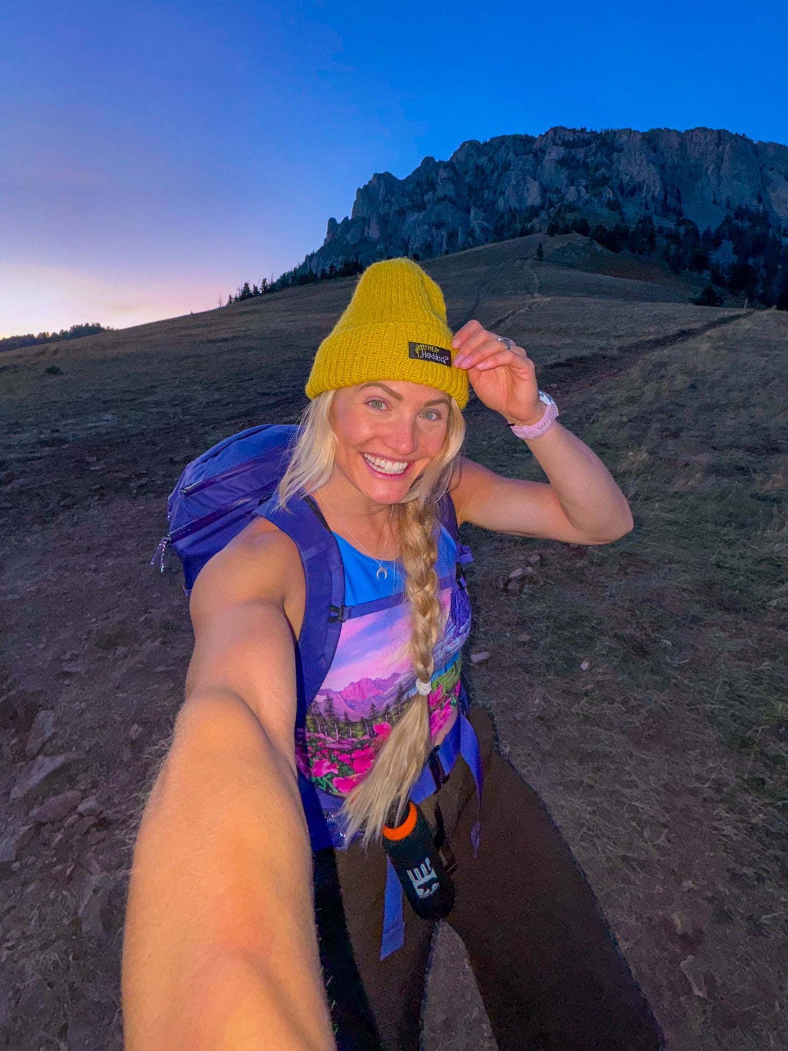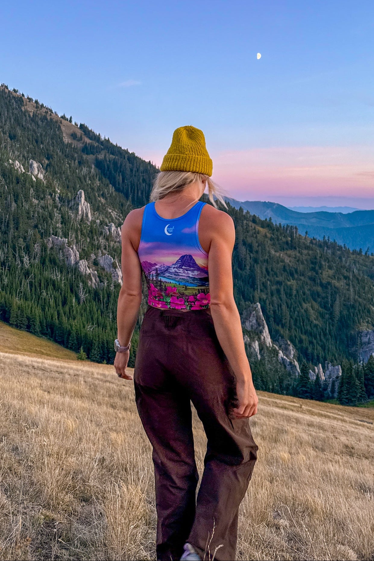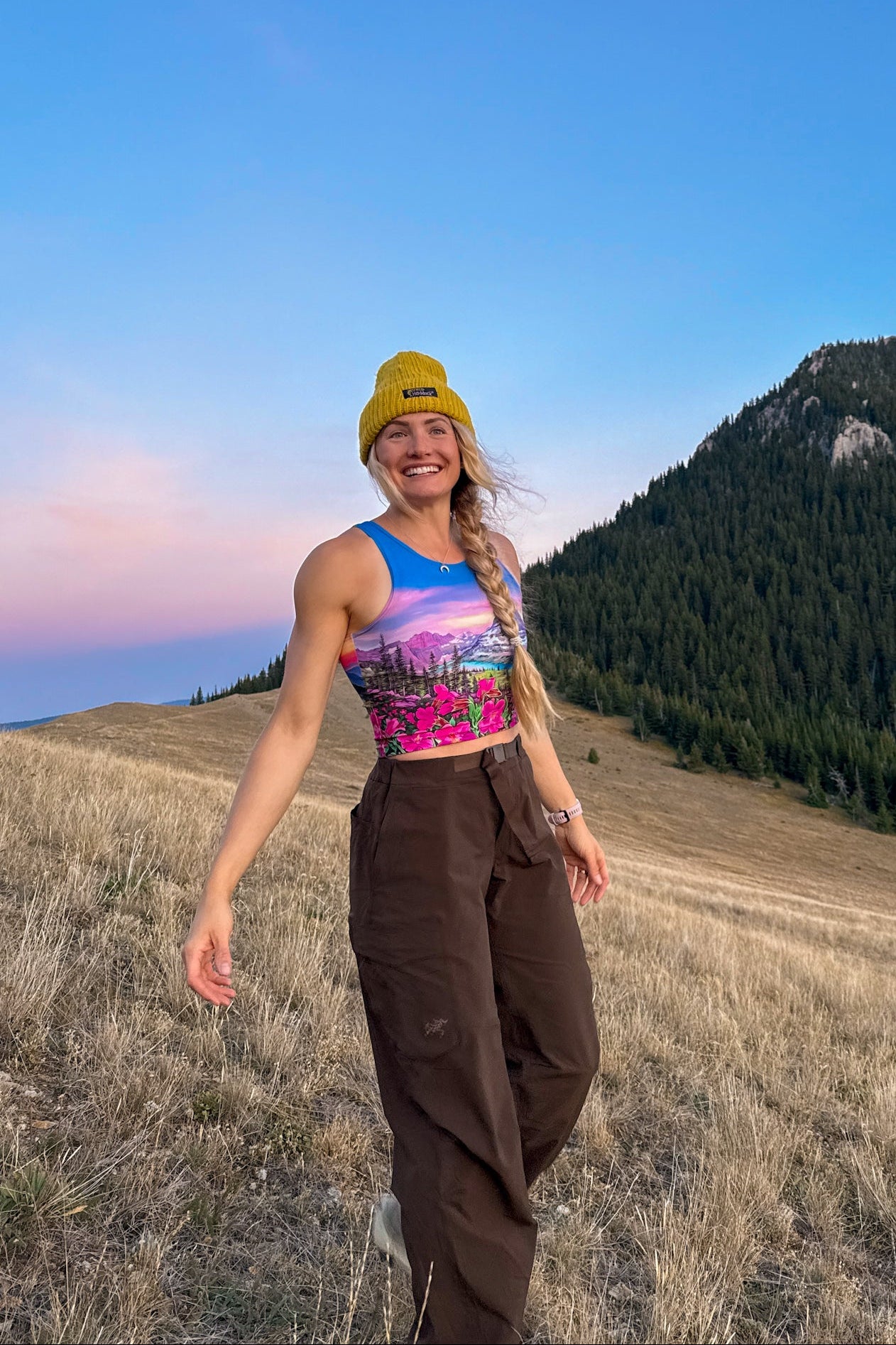 This gorgeous crop is printed with Rachel's "Bearhat Mountain Dusk" original painting in vibrant pinks, purples, greens, and blues.