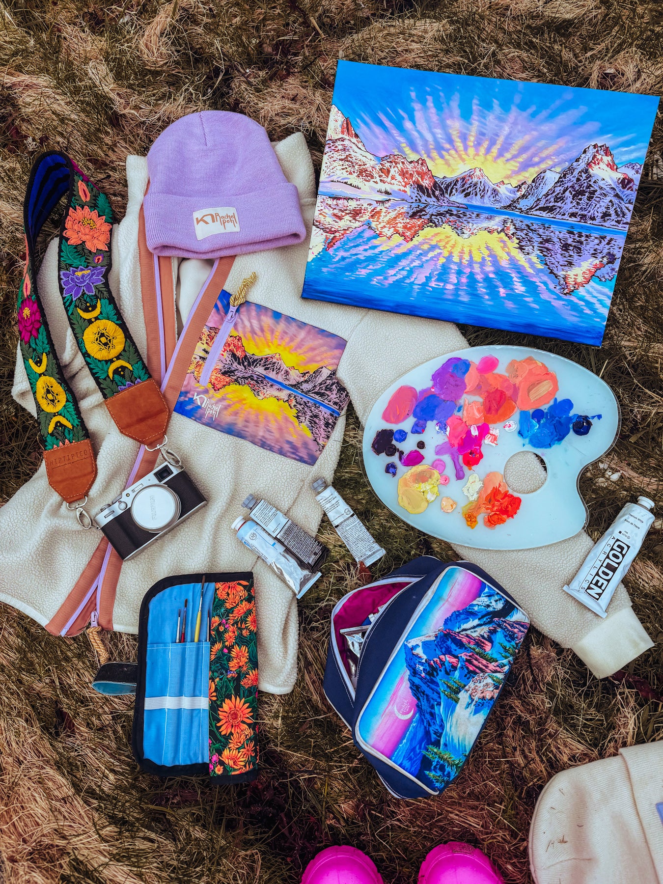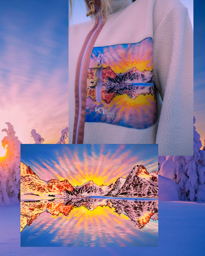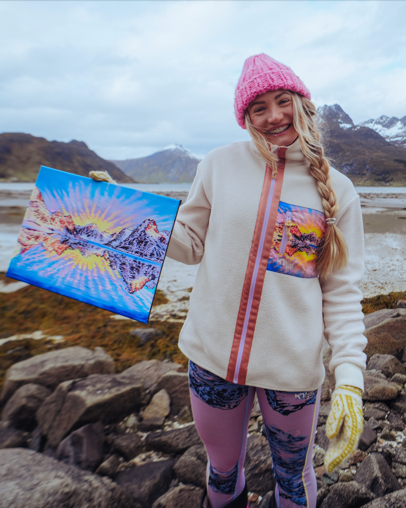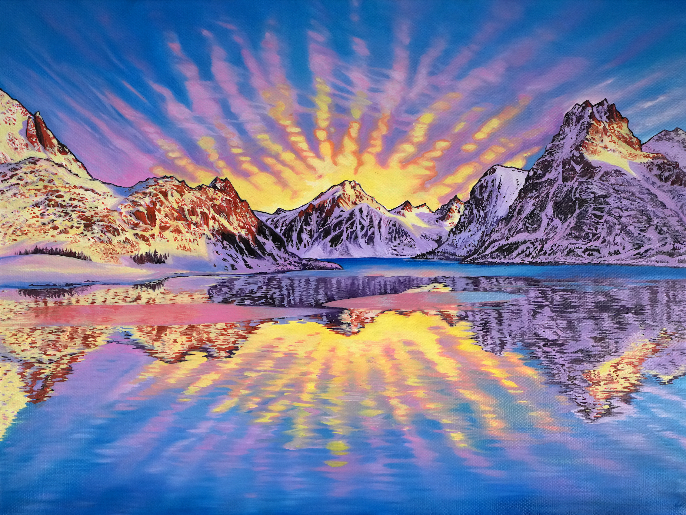 This colorful print of the Lofoten Islands in winter will capture your imagination! From the gorgeous color palate to the sunburst of clouds, this piece will capture your imagination and bring the magic of the arctic to your home. Originally painted for Rachel's Kari Traa clothing collection, this special piece is bursting with energy from the glowing sunrise clouds to vibrant complementary colors, and exquisite detail.