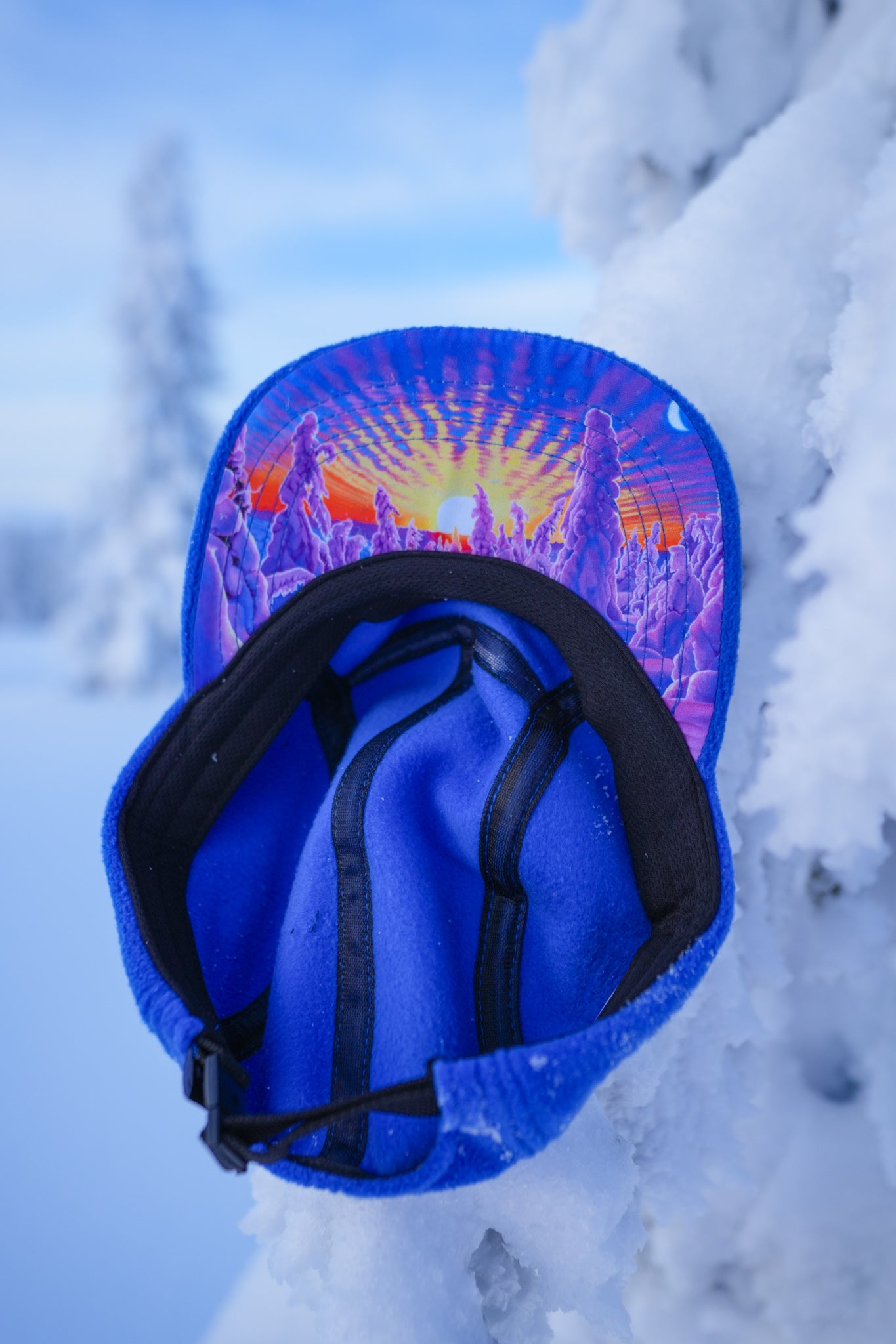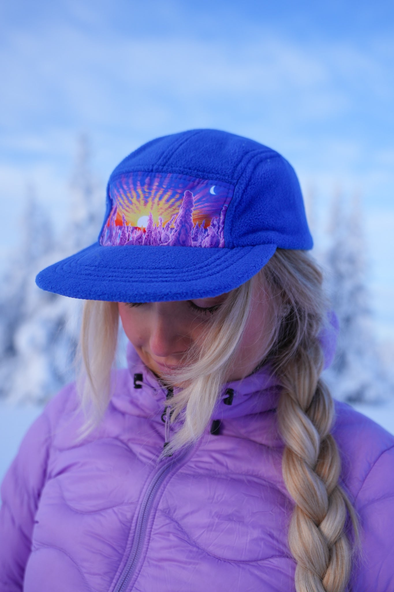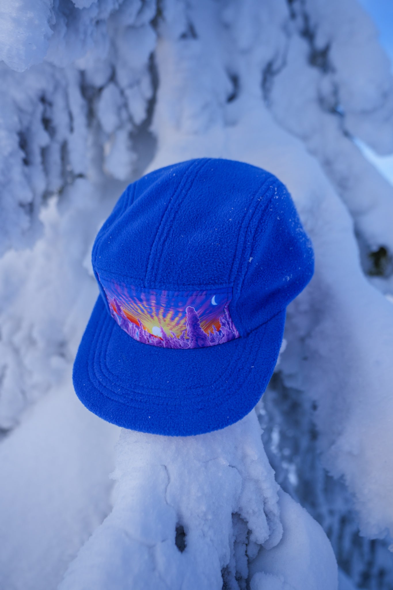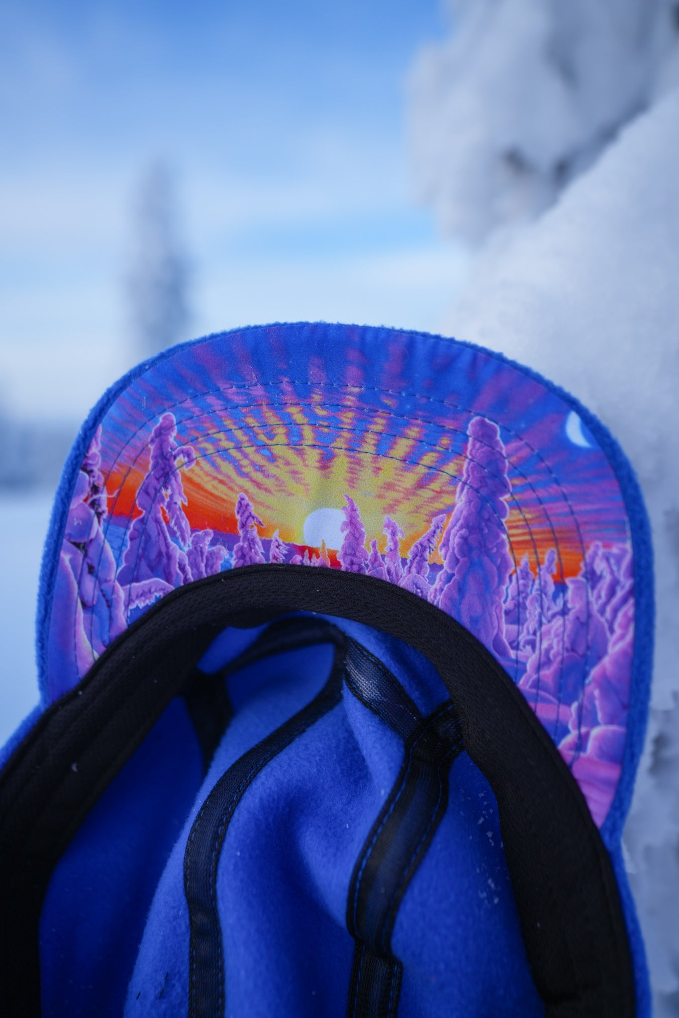- Sublimated artwork of the original painting "The Snowy Path" on front panel and under the brim