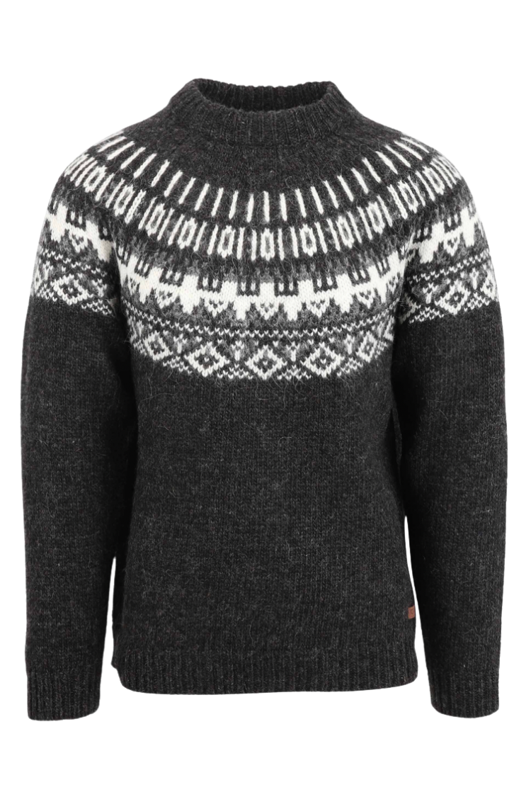 This machine knit wool sweater features a classic Icelandic design and traditional pattern. Made from Icelandic wool, by the brand Icewear.