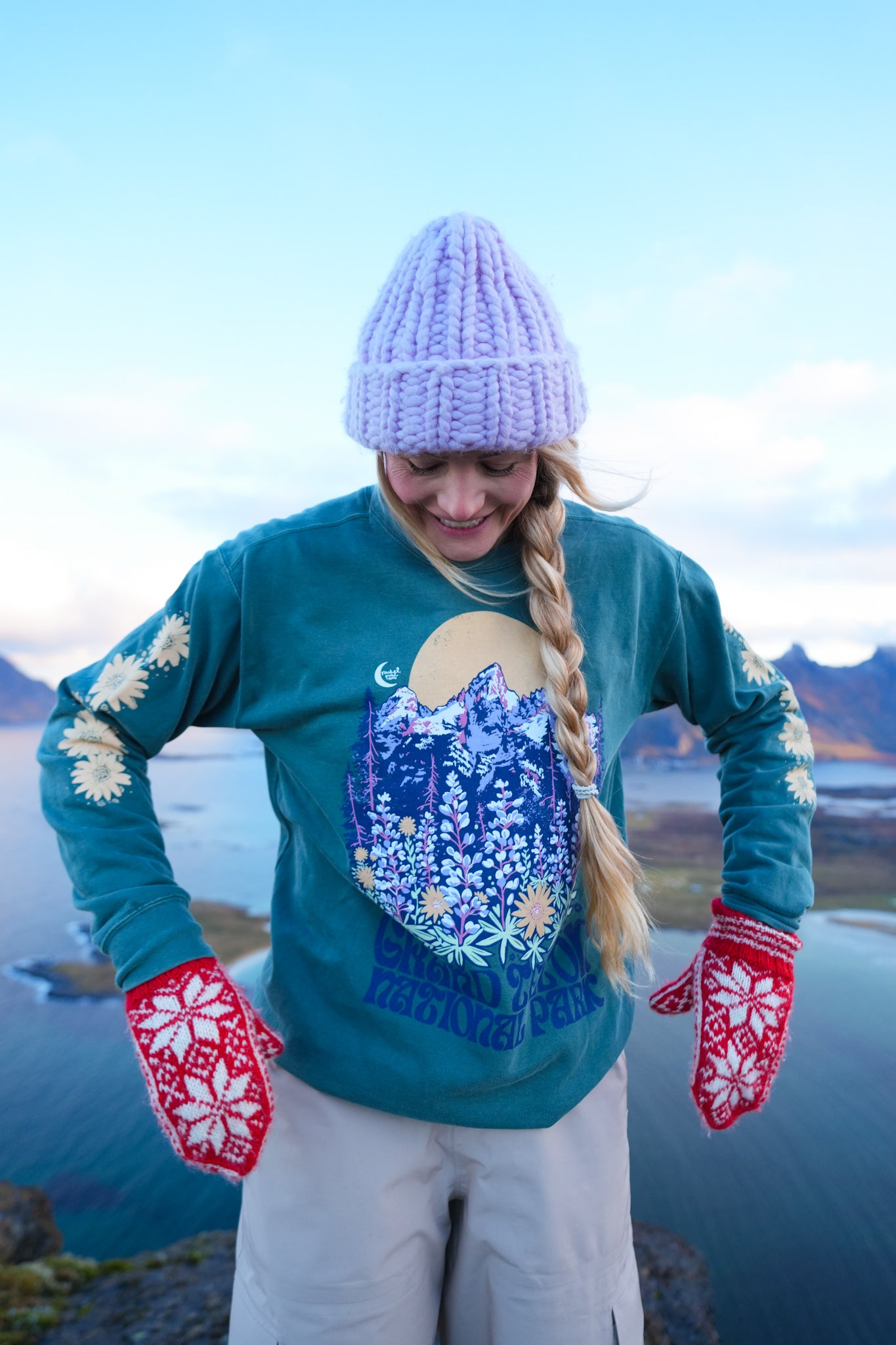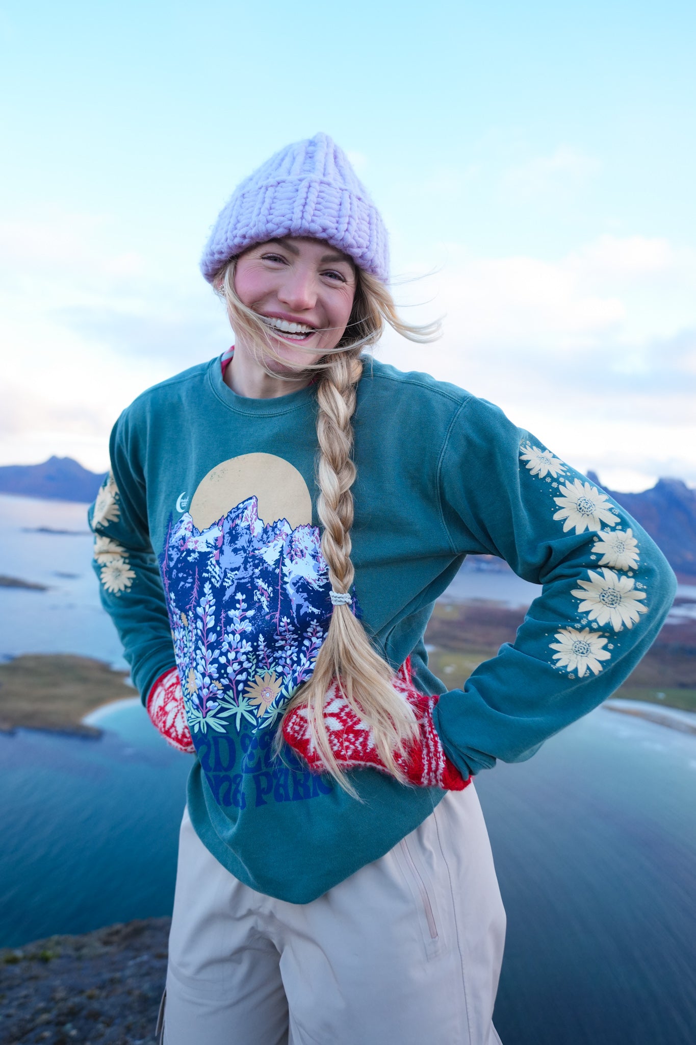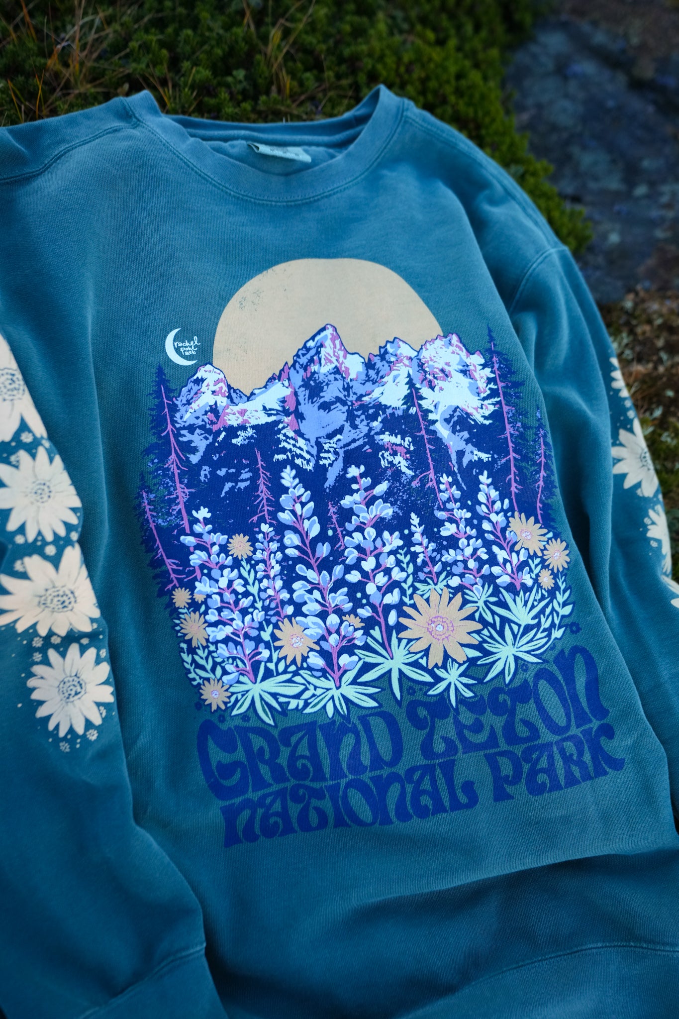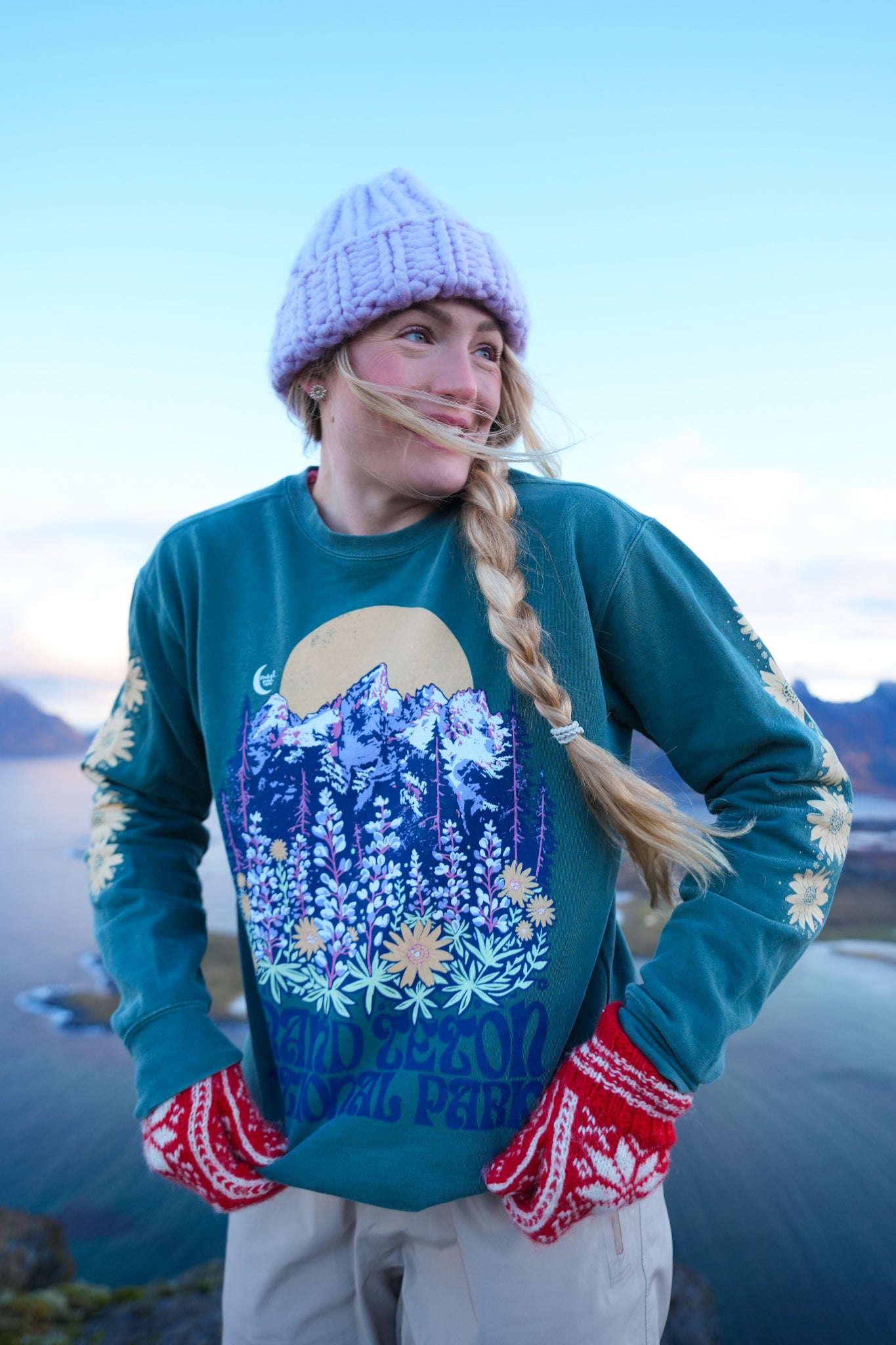 Enjoy being cozy all year long with this stunning, super-soft, forest green sweatshirt! The vibrant, detailed graphic of the Grand Tetons, lupine, and arrowleaf balsamroot on a summer day was masterfully screen printed in Montana by our friends at Front Line Design. This crew neck sweatshirt has that perfect lived-in feel, but feels completely unique thanks to the flowers that cascade down the sleeves, and the ultra detailed graphic. This sweatshirt will remind you of vintage National Park Posters, but in Rachel's distinctive style. Size up for an oversized look.