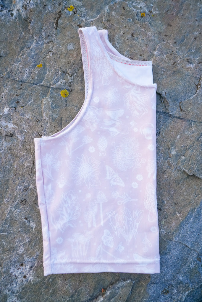 The most perfect, comfortable, durable, beautiful crop top for all your adventures, from running, biking, and yoga to camping, climbing, or just wearing around town. Made from recycled plastic bottles and spandex, your crop is easy on the environment, AND it’s soft, stretchy, and supportive for your body. It is printed with Rachel’s digital khaki and white nature pattern.
